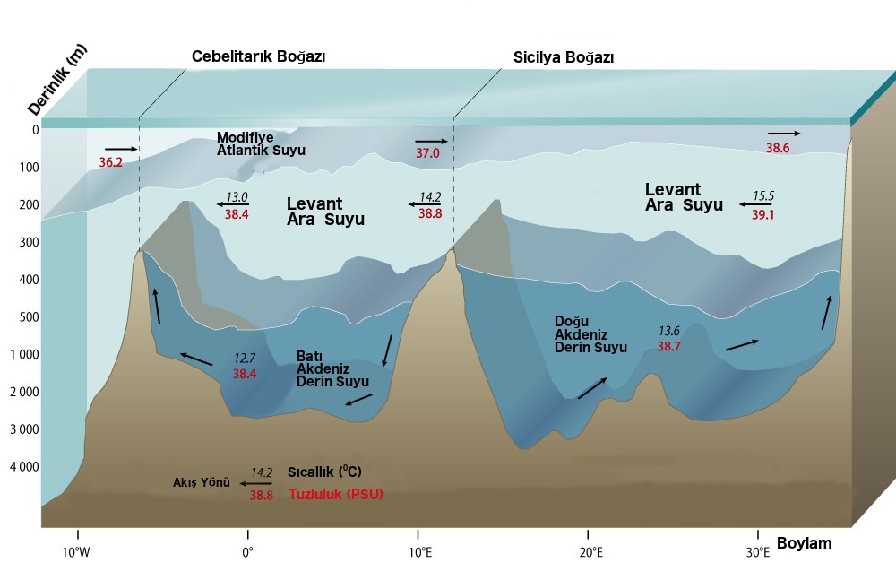 Akdeniz, Cebelitarık boğazı üzerinden Atlantik Okyanusu’na bağlanır. Ana dolaşım, yüzeyde Atlantik suyu girdisi olarak tarif edilir ve bu akıntı doğu Akdeniz’e ulaşır ve tekrar Levant Baseni’nde oluşan ara su olarak geri döner. Atlantik suyu Batı Akdeniz’de siklonik dolaşım sergiler ayrıca orta ölçekli ve büyük girdaplar aracılığı ile Atlantik suyu iç kesimlere taşınır (Tanhua vd., 2013). Levanten havzası, nispeten daha yüksek ısı akısına sahiptir ve bu tabakalaşmaya neden olur, bu nedenle havza ölçekli sirkülasyon, termohalin zorlamanın bir sonucudur.